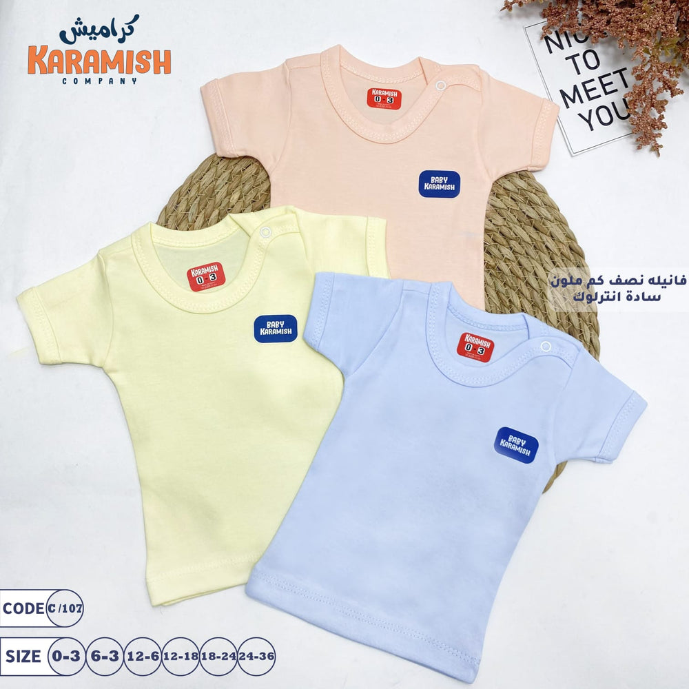 فانلا بيبي نص كم قطن %100ضد الحساسية والوان هادئة فتحة رقبة مريحة مع كباسين جانبية لتسهيل اللبس والخلع